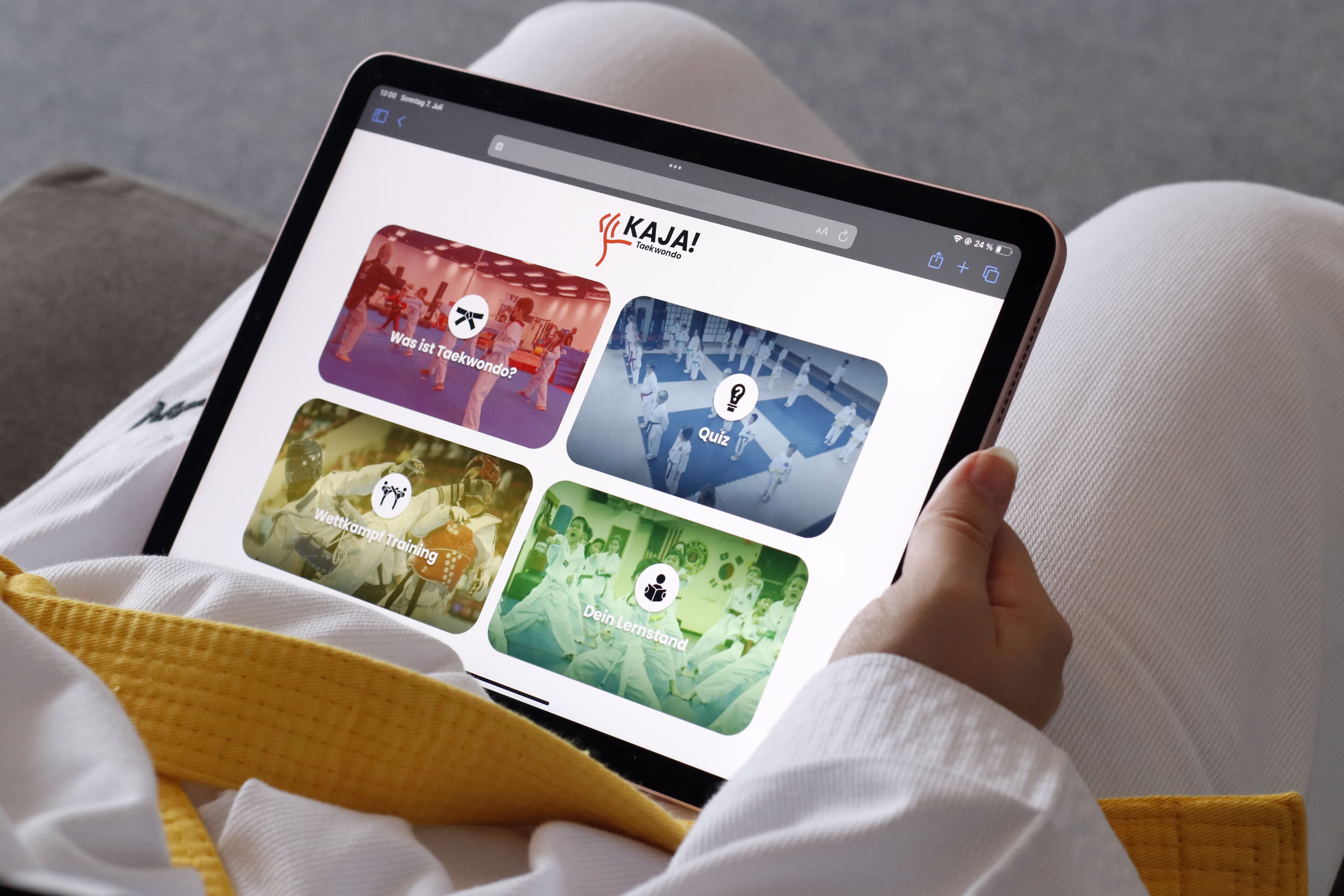Kaja! ist eine pädagogische E-Learning Anwendung für das Ipad, gezielt erstellt für Kinder von 7 bis 11 Jahren, um bei der Vorbereitung auf Taekwondo-Gürtelprüfungen Unterstützung zu liefern. Sie bietet umfangreiche Informationen über die Historie, Terminologie und Techniken des Taekwondo. Ein interaktives Quiz und ein Lernspiel dienen dazu, das erworbene Wissen zu überprüfen und zu vertiefen. Mit der Fortschrittsüberwachungs-Funktion kann der persönliche Lernfortschritt ständig überwacht werden. Kaja! gewährleistet effektives und vergnügliches Lernen und ist der perfekte Partner auf dem Pfad zur nächsten Gürtelprüfung.